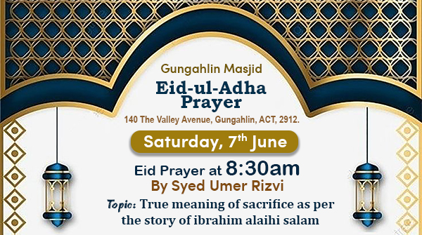 Eid-ul-Adha (based on local moonsighting, facilitated by CMC) will be joyously observed at Gungahlin Masjid on the following date/time: