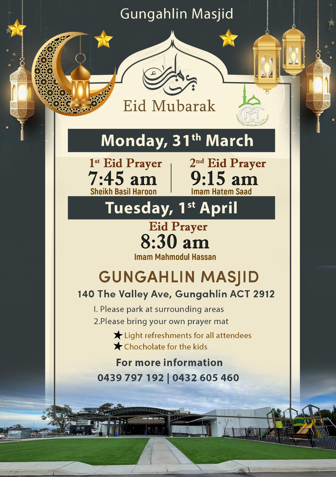 Eid-ul-Fitr will be joyously observed at Gungahlin Masjid on the following date/time: