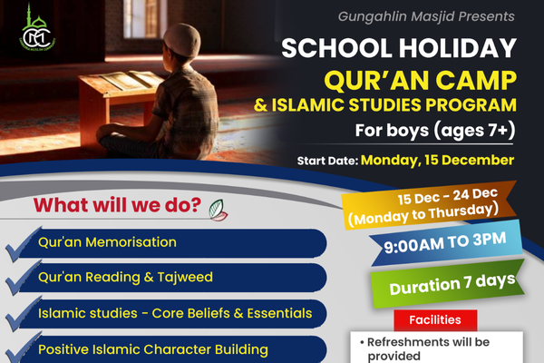 Gungahlin Masjid is pleased to present the School Holiday Qur’an Camp & Islamic Studies Program, designed to help young boys strengthen their connection with the Qur’an and build a strong foundation in Islamic knowledge and character during the school holidays.